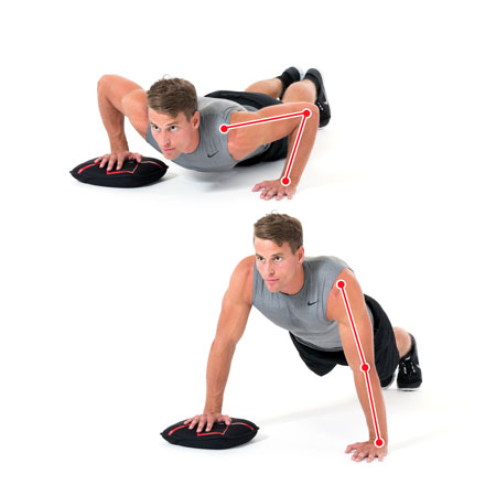 Bei der Sand-Pad Übung Push-up wide stützt Du dich abwechselnd mit der linken und rechten Hand auf das Sand-Pad. Die Liegestütz Variante trainiert, neben dem Brustmuskel, auch den Sägemuskel intensiv.
