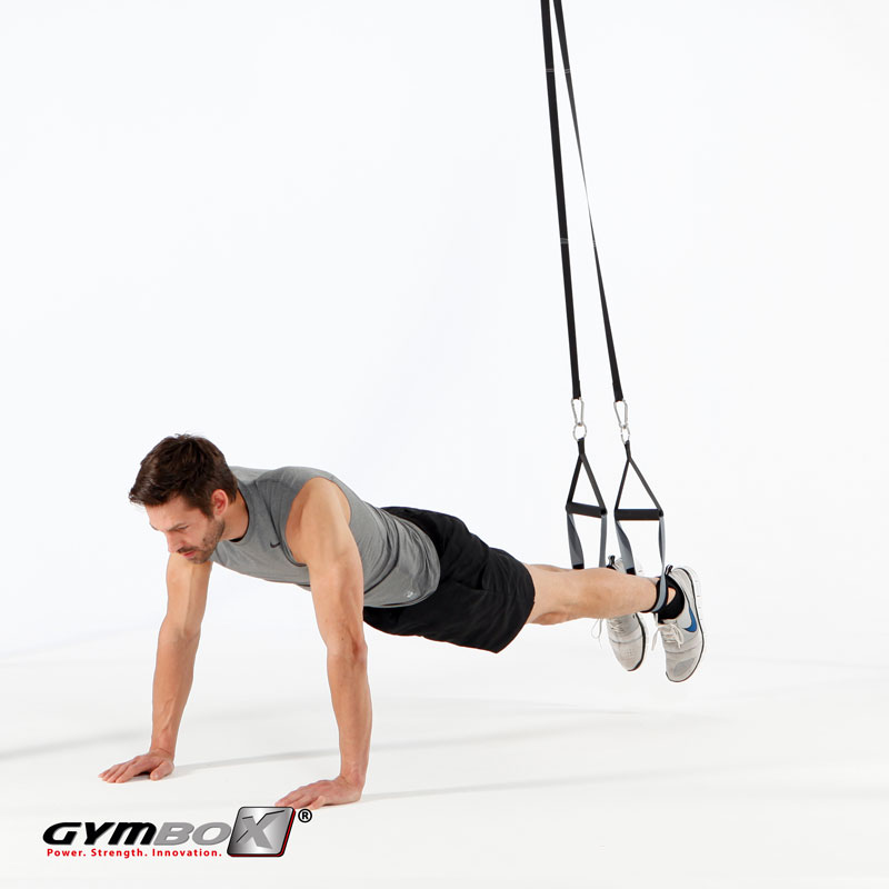 - Je nach gewünschter Intensität, sind die Füße oder Unterschenkel in den Schlaufen eingehangen. Der Körper ist auf den Händen gestützt und in Bauchlage gehalten. Der Bauch ist angespannt und das Gesäß leicht angehoben.